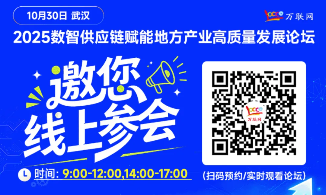 为此,作为国内领先的产业数字化与产融创新智慧服务平台,万联网定于2025年10月30日在武汉举办2025数智供应链赋能地方产业高质量发展论坛,本次论坛还获得了简单汇信息科技(广州)有限公司、志豪链云科技有限公司、四川享宇科技有限公司、山东省和力供应链有限公司等企业的鼎力支持!本次论坛以线下论坛+线上直播(万联网视频号)的形式举办,万联网视频号将全天同步开启直播,没到现场参会的朋友,可戳上方卡片立即预约/实时观看直播!