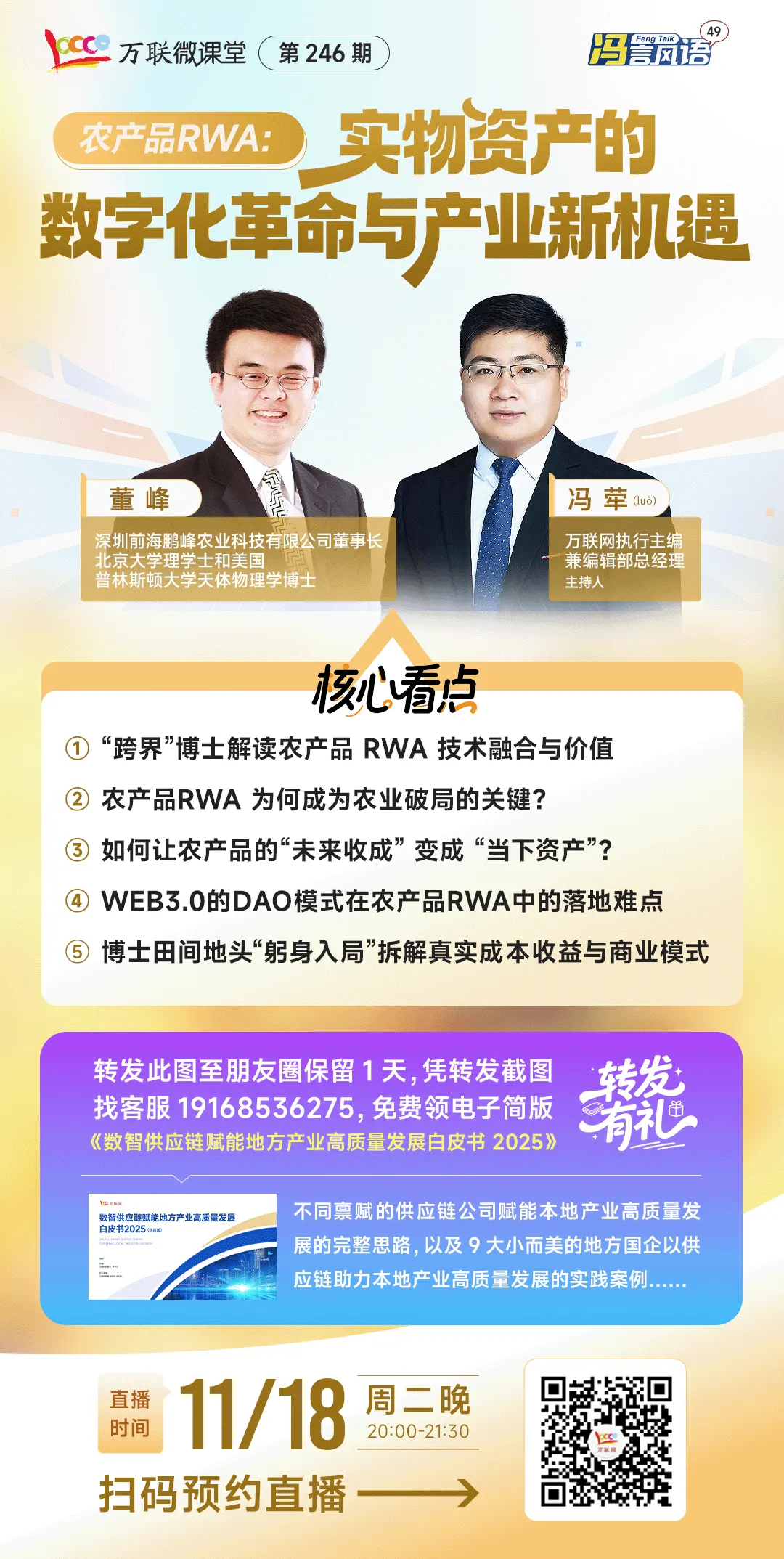 所以,为帮助大家找到RWA之下农产品供应链业务的新机遇,2025年11月18日晚上8点,我们特别邀请到了现任深圳前海鹏峰数贸科技有限公司董事长、曾任中国工商银行总行贵金属业务部交易业务负责人及平安商贸有限公司总经理、广东省第十三届党代会党代表、深圳市第七次党代会党代表,以及深圳市决策咨询委员会委员、中国特色社会主义先行示范区金融组专家、北京大学理学士和美国普林斯顿大学天体物理学博士【董峰】,他既有普林斯顿博士的学术视野,又有工商银行&平安银行的金融实操经验,还更懂田间地头的实际痛点,这次他将与万联网执行主编兼编辑部总经理冯荦先生展开深度对话,给你分享【从技术落地到产业共赢——农产品 RWA:实物资产的数字化革命与产业新机遇】,敬请期待!
