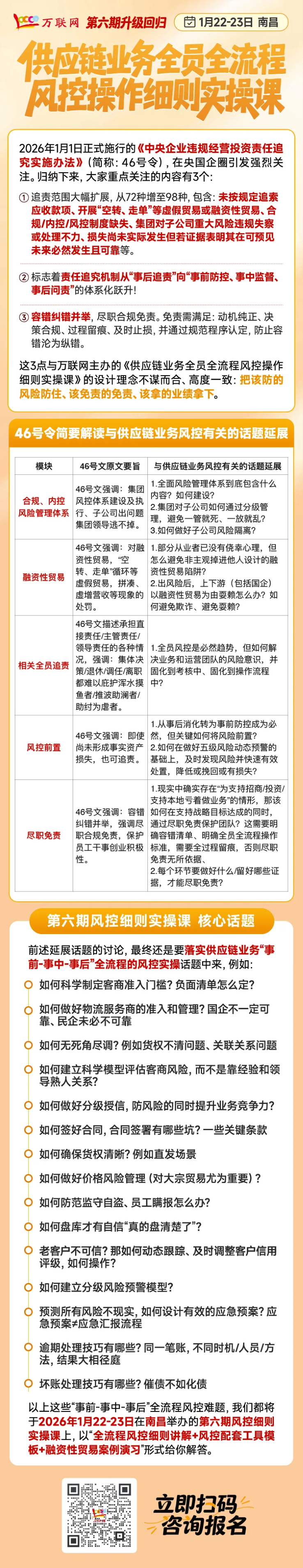 为助力国企供应链公司以最快速、最省钱、最省力的方式升级风控工作的方式方法,自检业务中的不合规与风险点,建立起供应链业务负面清单,并形成一套完整的覆盖全流程、全员参与的风控操作细则规范,万联网将于2026年1月22-23日在南昌举办第六期《供应链业务全员全流程风控操作细则实操课》。前五期课程一经推出,便累计吸引了400多位来自近200家大型国企集团的高管组团报名。