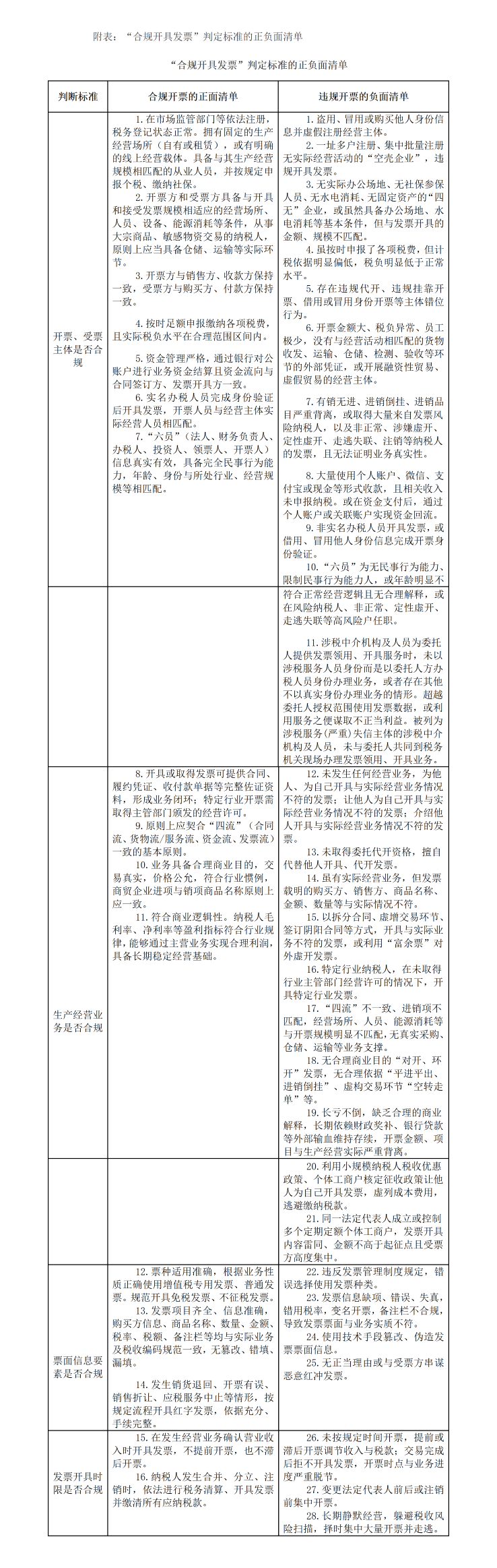 其中,28条负面清单明确了要查“四流”不一致、进销项不匹配,经营场所、人员、能源消耗等与开票规模明显不匹配,无真实采购、仓储、运输等业务支撑以及无合理商业目的“对开、环开”发票,无合理依据“平进平出、进销倒挂”、虚构交易环节“空转走单”等行为。