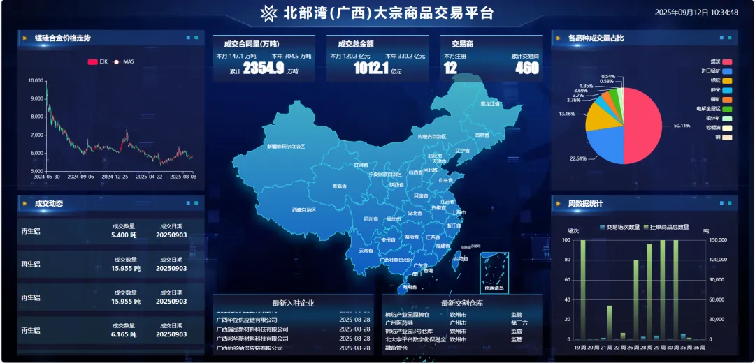 北大宗平台依托钦州港的优质资源背景,以大宗商品为切入点,提供进口代采、国内集采、商品竞价、产能预售、基差点价等全产业链多元化线上交易服务,吸引了东南亚等不同区域的境内外市场主体参与线上交易,持续拓展粮油、有色金属、林浆纸、新能源材料、能源化工等临港产业供应链服务,逐步构建起丰富多元的大宗商品交易品种体系。截至2025年9月12日,北大宗平台累计交易额达1012.1亿元,现货交收量达2354.9万吨,会员企业数量为460家。