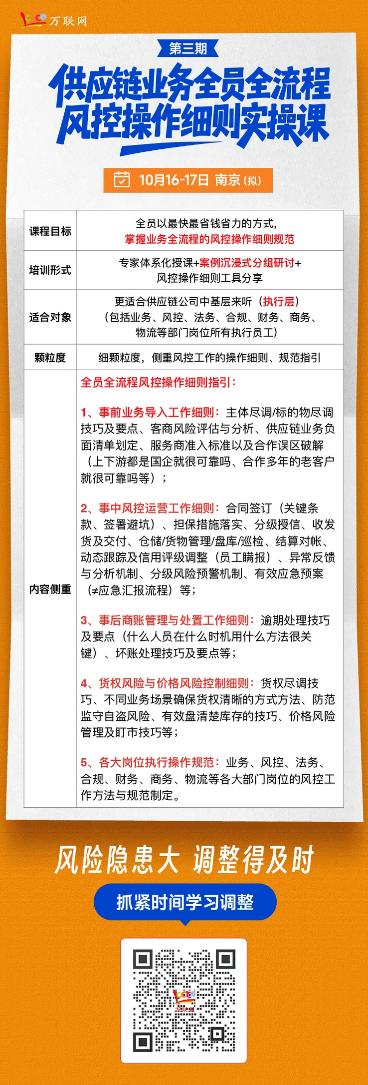 所以,为助力供应链公司用好现有团队做好全流程风控工作,我们将于10月16-17日在南京举办第三期《供应链业务全员全流程风控操作细则实操课》,旨在帮助各地国企供应链公司以最快速、最省钱、最省力的方式升级风控工作的方式方法,自检业务中的不合规与风险点,建立并完善全员参与、覆盖全流程的风控操作细则规范。