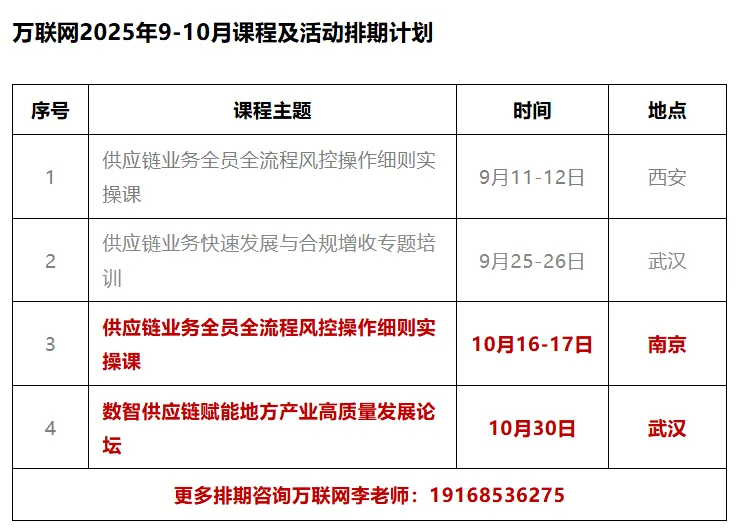 往期参与万联网专题课程、入企培训、寻求战略规划与辅导、合规与风险诊断、构建全面风险管理体系等服务的部分企业名单:滕州国资委、江苏省商务厅、中国物资储运集团、中国煤炭科工集团、中国兵工物资集团、中国航油集团、中国石油、五粮液集团、新疆国投资本、江苏汇鸿国际集团、广州发展能源物流集团、广西北部湾投资集团、湖北商贸物流集团、新疆商贸物流集团、广州越秀集团、历城控股集团、江西财通供应链金融集团、陕西交控集团、陕西金控集团、厦门信达、厦门海峡、厦门港口、河南投资集团、河南煤炭储配交易中心、武汉长江国际贸易集团、淮北矿业集团、深圳港物流集团、深圳中电投资、草都集团、深粮控股、山东融汇物产集团、山东稼轩人才发展集团、江苏连云港港物流、上海链接者集团、苏州高新人才发展集团、光明食品集团、青岛人才集团、合肥市产业投资控股、包头正信集团、内蒙古交通集团、丰城金融控股集团、鹤壁绿康、四川盛途供应链、易见供应链、江苏金农股份、顺丰数科、秦岭数字、南京德乐科技、中壬银兴信息技术、惠州港口投资集团、广东省电信规划设计院、中新联上海实业、山西焦煤集团、晋陵集团、内蒙古圣圆能源集团、大庆市国投集团、淮安水利物资、山西天地王坡、贵州铁投、河南投资集团、前海产业发展集团、安琪酵母、山东民生资源集团、通汇资本、中油物流、江苏沿海开发集团、安吉物流、佛燃能源、江西江投资本、黑龙江睿资产经营、江西蓝投、丰城金控、许昌金控、许昌投资、金航商业保理、中国建设银行、中国工商银行、招商银行、九江银行、众邦银行、吉林银行、北京银行、海峡银行、泸州银行、聊城金投控股、越秀融资担保...