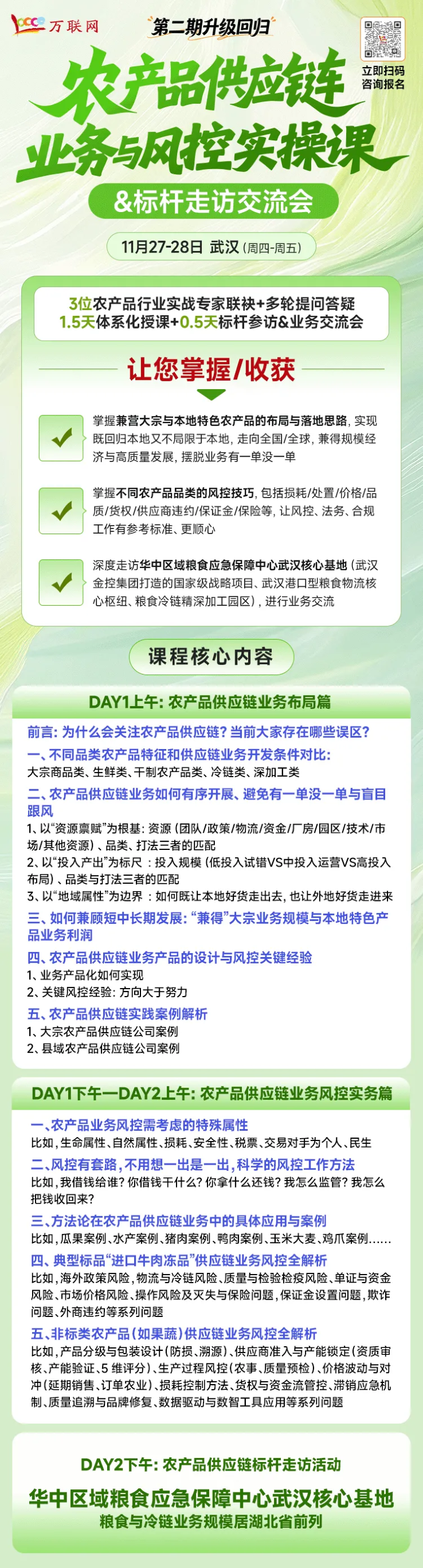 2025年11月27-28日,万联网定于武汉举办第二期《农产品供应链业务与风控实操课》,特别邀请成功助力多地政府及国企构建农产品供应链综合服务平台(彭州市政府-农产品电子仓单融资平台、内蒙包头正信集团仓单管理公司-动产融资平台、安徽阜阳大数据运营公司-农产品供应链服务平台)、 拥有多年互联网+产业模式创新经验、深谙非标农产品供应链业务风控的四川享宇科技有限公司项目总监【康小虎】亲临课程现场。