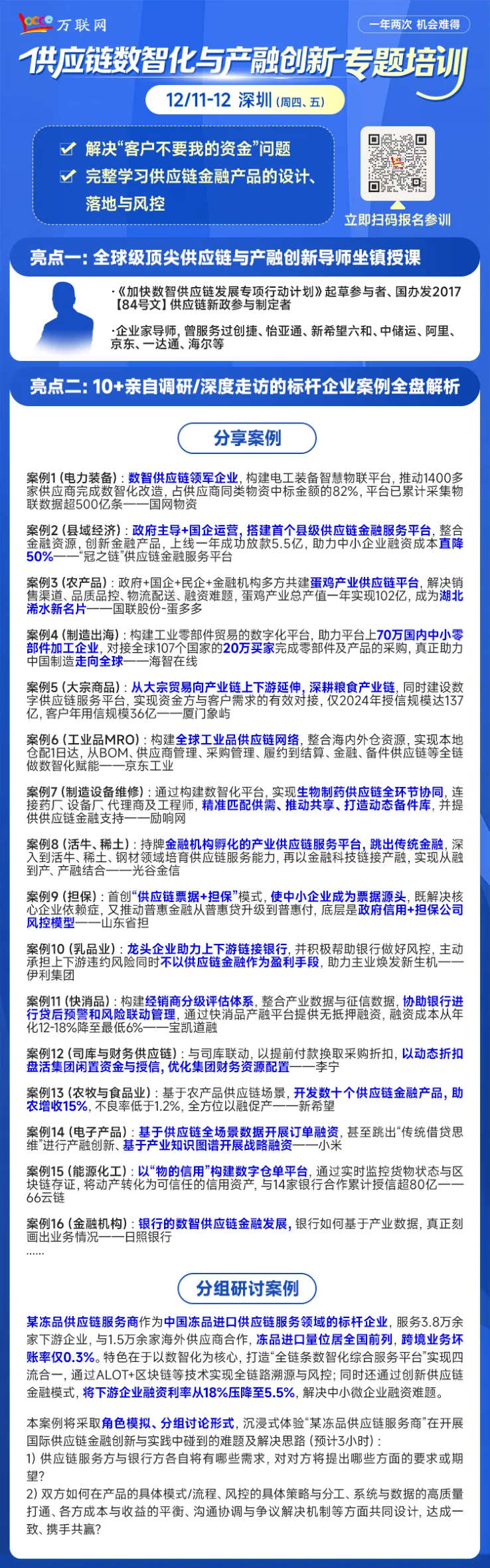 所以,为助力国企在开展供应链金融业务过程中,能够摆脱纯粹垫资模式,与政府/银行/金融科技等共同创新供应链金融产品,并做好全流程的风险控制,我们与世界级顶尖供应链与供应链金融学者、商务部市场调控专家库专家、国办84号供应链新政参与制定者、《加快数智供应链发展专项行动计划》起草参与者、数十家国内知名企业导师【宋教授】联袂打造了“供应链产融创新专题培训”,计划于2025年12月11-12日在深圳开班!希望借此课程,并结合16大供应链产融创新案例解析+1场脱核供应链金融案例分组研讨,助力国企把握供应链金融前沿趋势和监管要求,摆脱纯粹垫资模式,深度嵌入产业场景,构建生态供应链金融平台,助力本地实体经济及自身实现合规、低风险、高质量发展。本次课程将通过丰富案例解析+沉浸式案例模拟研讨,带你学习供应链产融创新的落地思路: