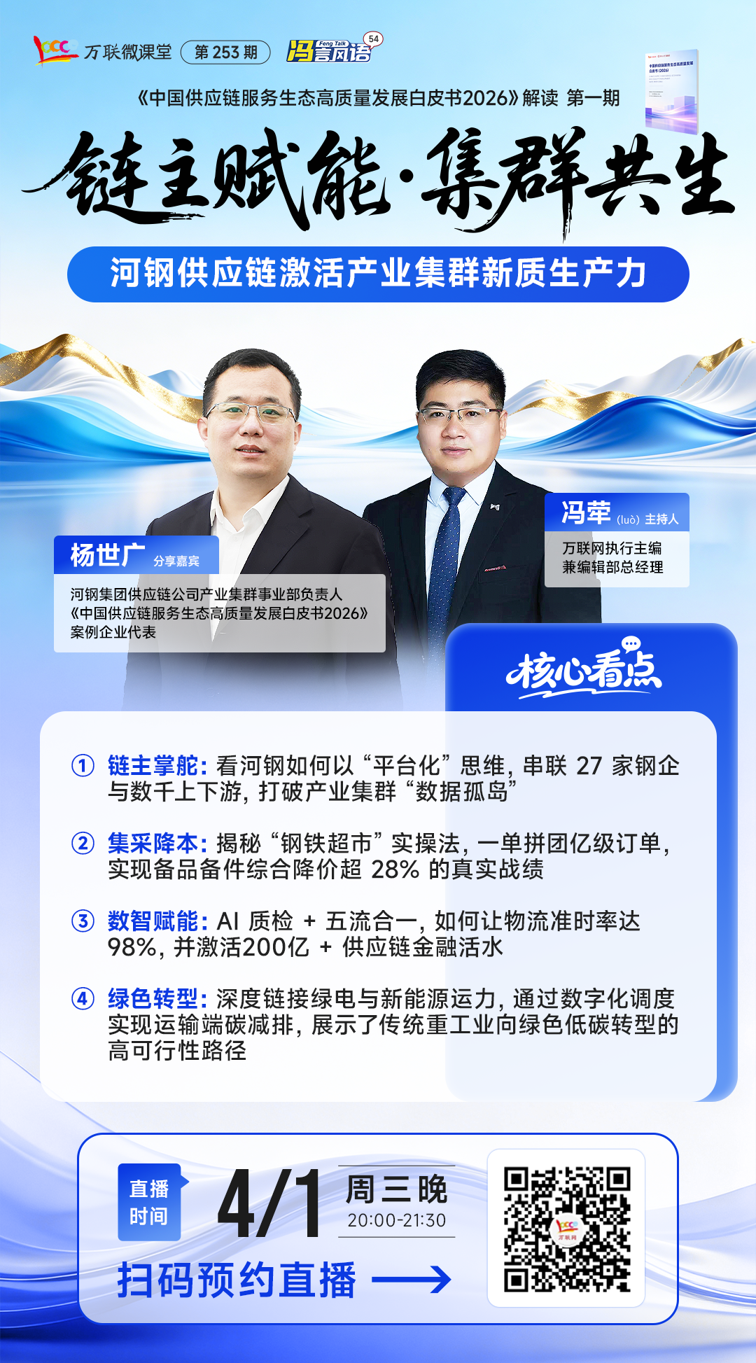 为此,2026年4月1日晚8点,我们特别邀请了一位地方国企代表,同时也是入选了由万联网联合中国人民大学中国供应链战略管理研究中心及一众业内专家编制的《中国供应链服务生态高质量发展白皮书2026》的案例企业代表——河钢集团供应链公司产业集群事业部负责人杨世广,做客万联网视频号直播间,分享他们服务本地特色产业集群的实践经验——河北省属链主国企【河钢供应链】,如何以 “平台化” 思维,串联27家钢企与数千上下游,打破产业集群数据孤岛,实实在在帮本地钢铁产业集群降本、提效、拿成果,给全国地方国企打了个可复制的样。